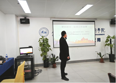 会上,我校武装部胡老师详细介绍了征兵职能部门建设、学生军事兴趣社团建设、兵员预征预储、上半年征兵宣传工作启动情况以及征兵进度等方面的工作内容。军分区代表对我校征兵工作的开展状况给予了肯定,同时就征兵工作经验进行了交流分享。其一,着重针对大学理工科毕业生开展宣传工作,为部队输送急需的专业人才;其二,把大学毕业生职业生涯规划教育与应征入伍相结合,以军旅生涯以及退伍后的就业创业政策为宣传亮点,积极引导毕业生们踊跃报名参军。